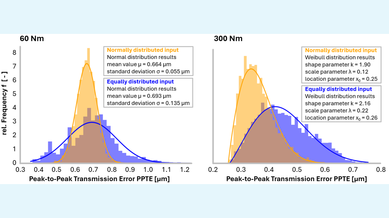 Zusätzlich werden nominale und mittlere PPTE-Kurven dargestellt. Die Streuung ist bei kleinen Drehmomenten höher, was auf eine größere Empfindlichkeit gegenüber Flankenmodifikationen hinweist. Bei höheren Drehmomenten nimmt sie ab, was eine erhöhte Robustheit zeigt. Die Auswertung konzentriert sich auf 60 Nm (niedrige Last) und 300 Nm (Auslegungslast). Die Häufigkeitsverteilungen werden mithilfe von Normal- oder Weibull-Verteilungen analysiert, um Standardabweichungen zu bestimmen und probabilistische Aussagen über die Drehwegfehlerbereiche zu ermöglichen.