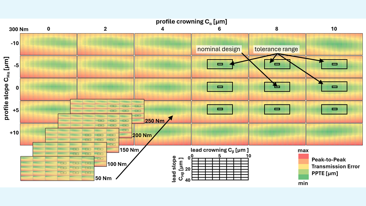 Die Ergebnisse werden in einem Variationskennfeld (Abbildung 3) dargestellt, das die kombinierten Effekte aller vier Parameter zeigt. Jede Zelle repräsentiert ein nominelles Design, während Toleranzfelder die Fertigungsstreuung veranschaulichen. Dabei wird eine hohe Verzahnungsqualität der Qualitätsstufe 5 gemäß ISO 1328 angenommen [6].