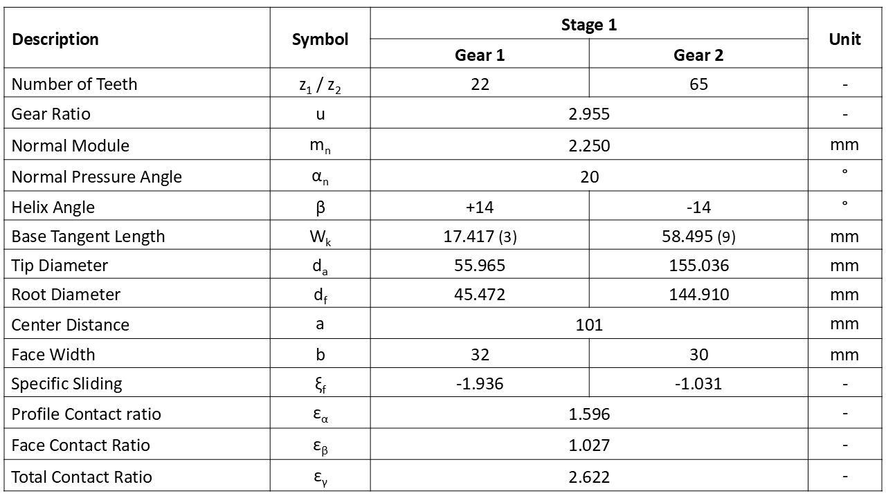 Im Rahmen dieser Studie wird ausschließlich die erste Getriebestufe betrachtet (Abbildung 2 und Tabelle 1).