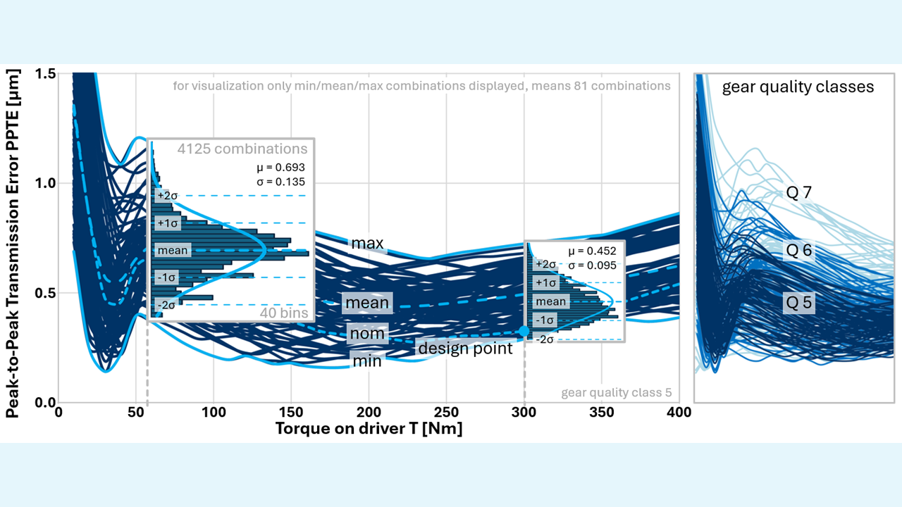 Ohne detaillierte Kenntnisse über die tatsächliche Fertigungsstreuung wird zunächst eine konservative Gleichverteilung der Flankenmodifikationen angenommen. Das bedeutet, dass alle Parameterkombinationen innerhalb des Toleranzbereichs als gleich wahrscheinlich betrachtet werden. Der PPTE wird für Drehmomente von 10 Nm bis 400 Nm in 10-Nm-Schritten berechnet. Die resultierenden PPTE-Kurven zeigen maximale und minimale Hüllkurven, die sich je nach Drehmoment unterscheiden und nicht einer einzelnen Worst- oder Best-Case-Konfiguration entsprechen (Abbildung 4).