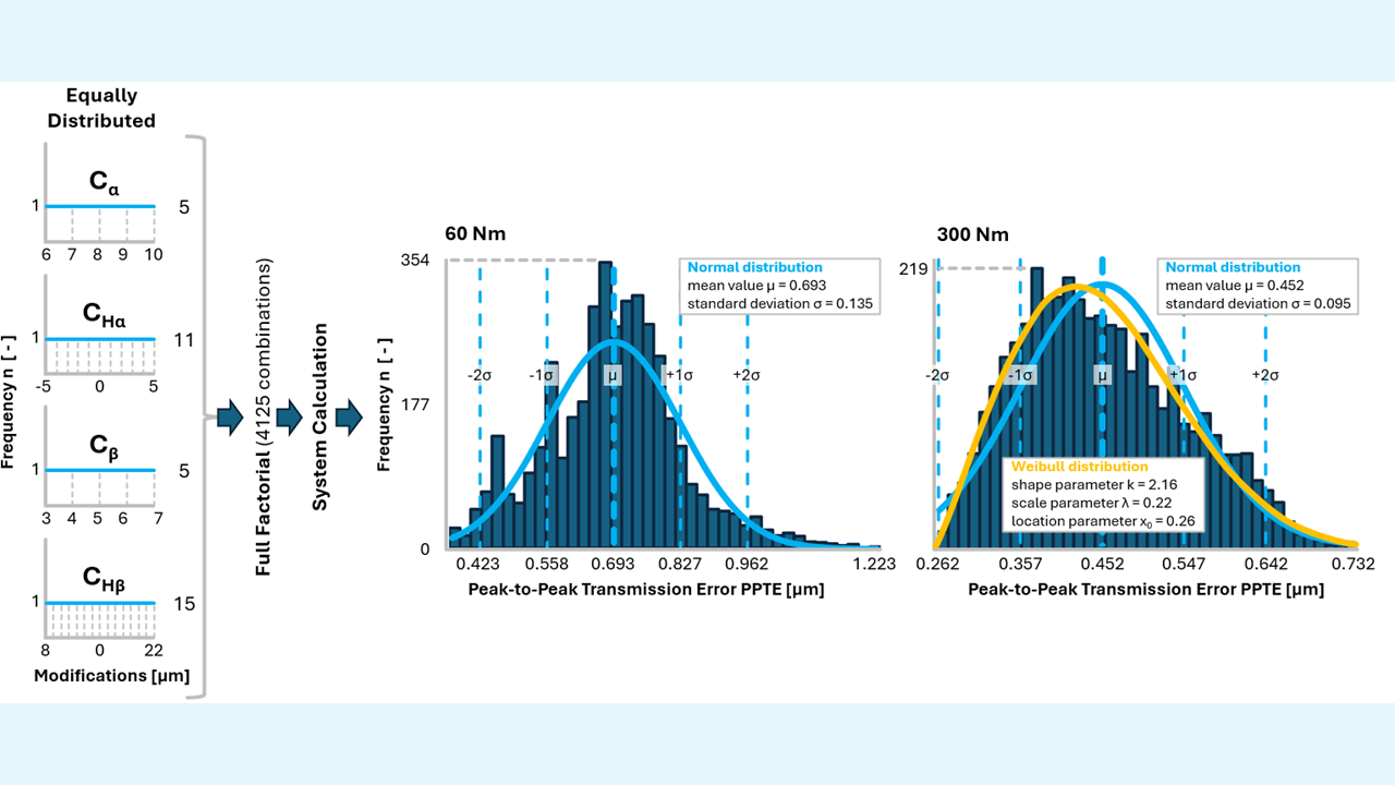 Höhere Verzahnungsqualitäten verringern das Toleranzfeld und reduzieren den PPTE, während niedrigere Qualitäten zu einer größeren Streuung führen. Bei 60 Nm schwanken die Verteilungen stark und bilden keine glatten Kurven. Bei 300 Nm ist die Verteilung hingegen glatter und lässt sich besser durch eine Weibull-Verteilung beschreiben. Es wurde vollfaktoriell variiert und ganzzahlige Flankenmodifikationen verwendet, um eine Ausgewogenheit zwischen Auflösung und Rechenaufwand zu erreichen (Abbildung 5).