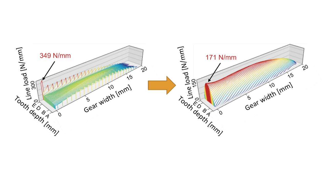 Die FVA-Workbench ermöglicht auch die lokale Bewertung der Pressungsverteilung und kann diese anschaulich dreidimensional darstellen. In Abbildung 2 wird beispielhaft die Gegenüberstellung zweier Berechnungsvarianten – ohne und mit Profilkorrektur – dargestellt. Neben der örtlichen Lastverteilung lassen sich eine Vielzahl an Merkmalen berechnen, die in der Folge Aussagen über das Betriebsverhalten einzelner Komponenten oder des Gesamtsystems erlauben.