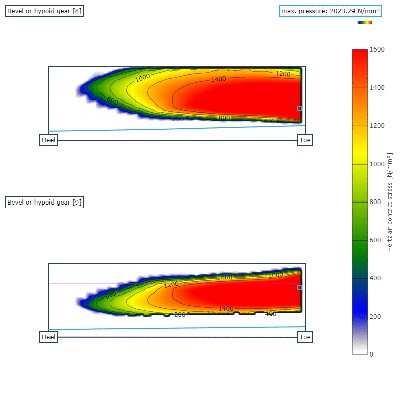 Abbildung 6: Auswirkung der Radkörperbreite des Tellerrades auf die maximalen Hertzschen Pressung auf der Ritzel- (oben) und der Tellerradflanke (unten); Radkörperbreite 17,1 mm