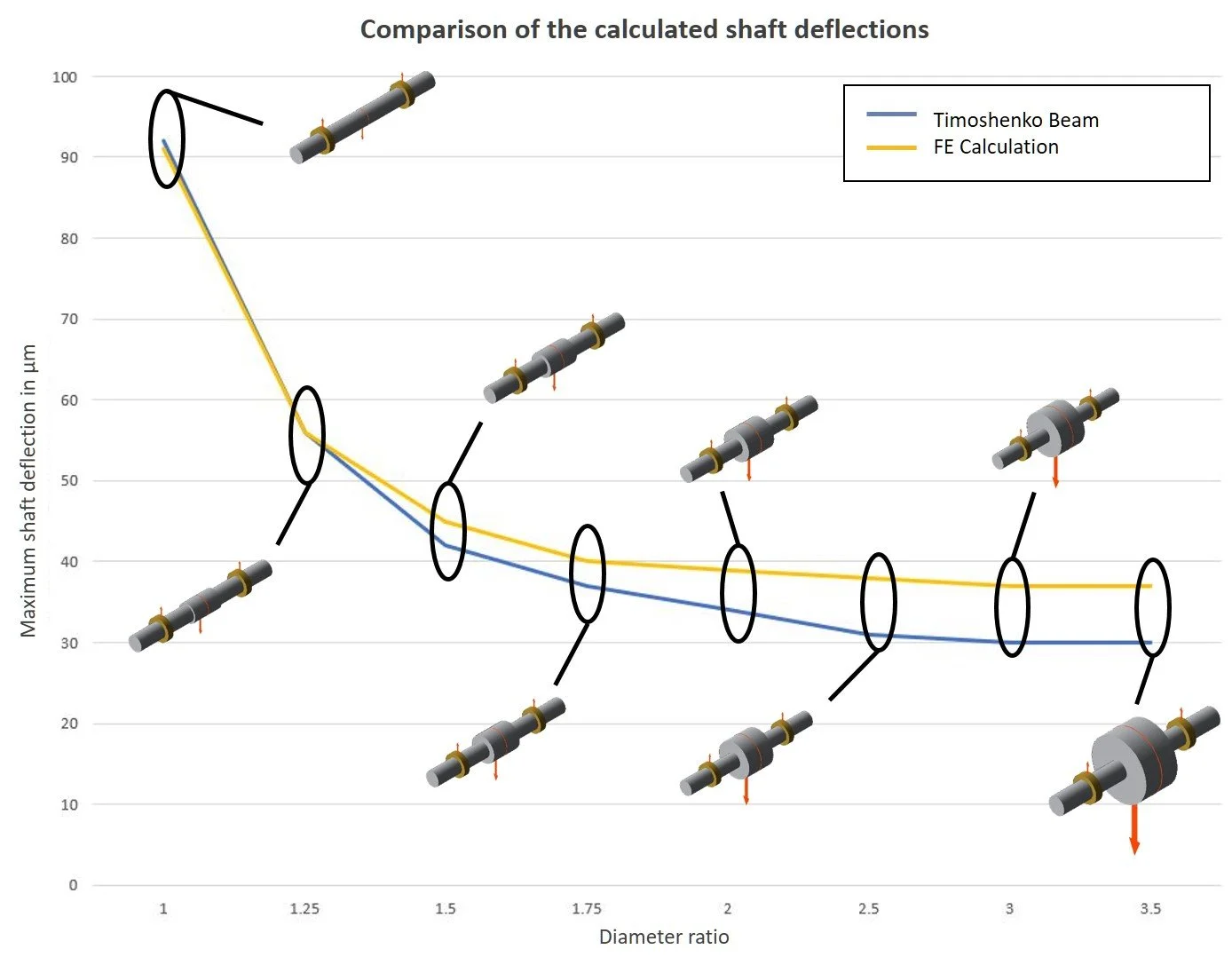 Ab einer Durchmesservergrößerung um das 1,25-fache berechnet die analytische Lösung für diese Wellengeometrie eine geringere Durchsenkung als die FE-Berechnung. Ab der 3-fachen Durchmesservergrößerung des mittleren Abschnitts ergibt sich für die FE-Berechnung eine konstant um 23% geringere Durchsenkung als bei dem analytischen Ansatz.