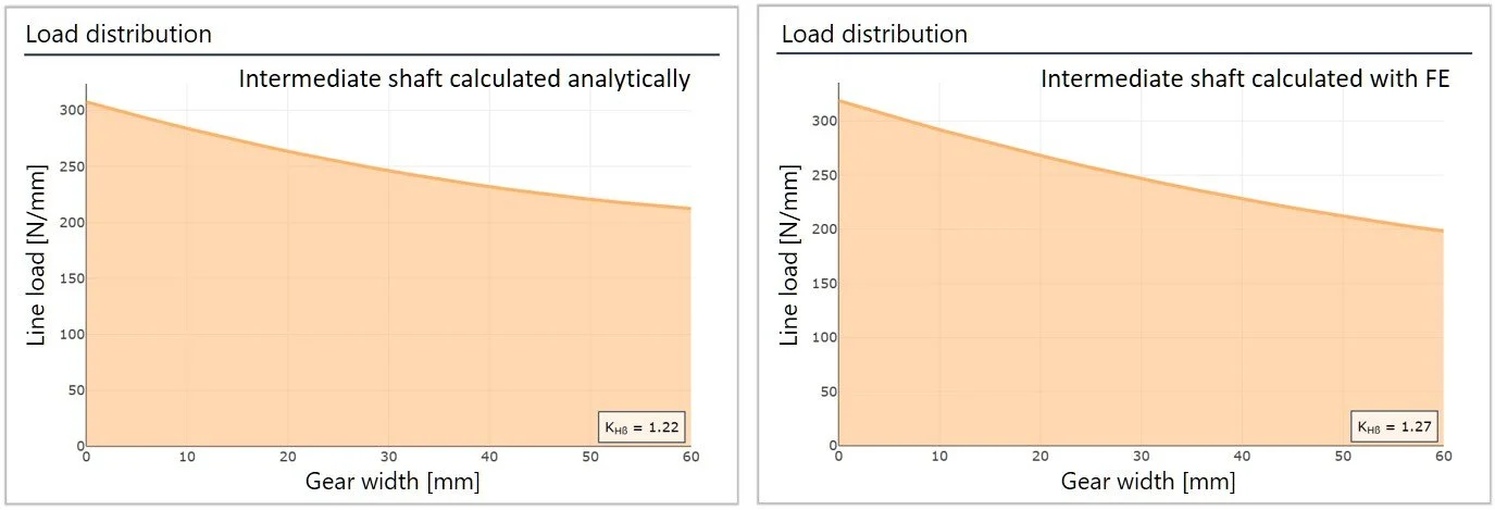 Bild 6 zeigt die Breitenlastverteilung für beide berechneten Varianten. Obwohl hier der Einfluss auf die Wellendurchbiegung nicht so stark ist wie bei dem theoretischen Beispiel in Bild 2, ist dennoch, durch die Berechnung der Zwischenwelle mit FE, eine merkliche Erhöhung des Breitenfaktors KHß von 1,22 auf 1,27 festzustellen.