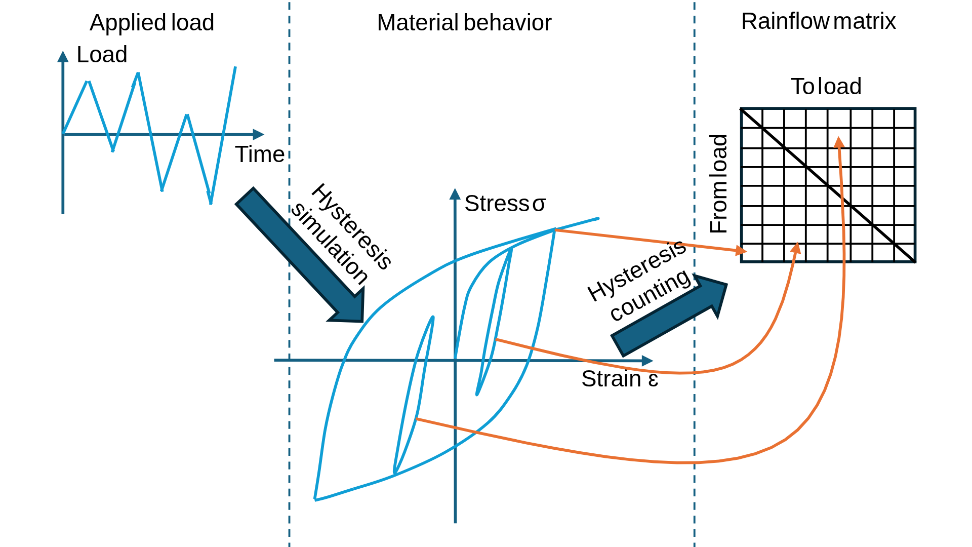 Die am häufigsten verwendete Methode ist die Rainflow-Zählung. Dabei wird eine komplexe, unregelmäßige Beanspruchungsfolge in einzelne, geschlossene Schwingspiele zerlegt. Die Rainflow-Zählung basiert auf einer werkstoffmechanischen Grundlage und kann als Algorithmus interpretiert werden, der nach geschlossenen Spannungs-Dehnungs-Hysteresen sucht (siehe Abbildung 1).