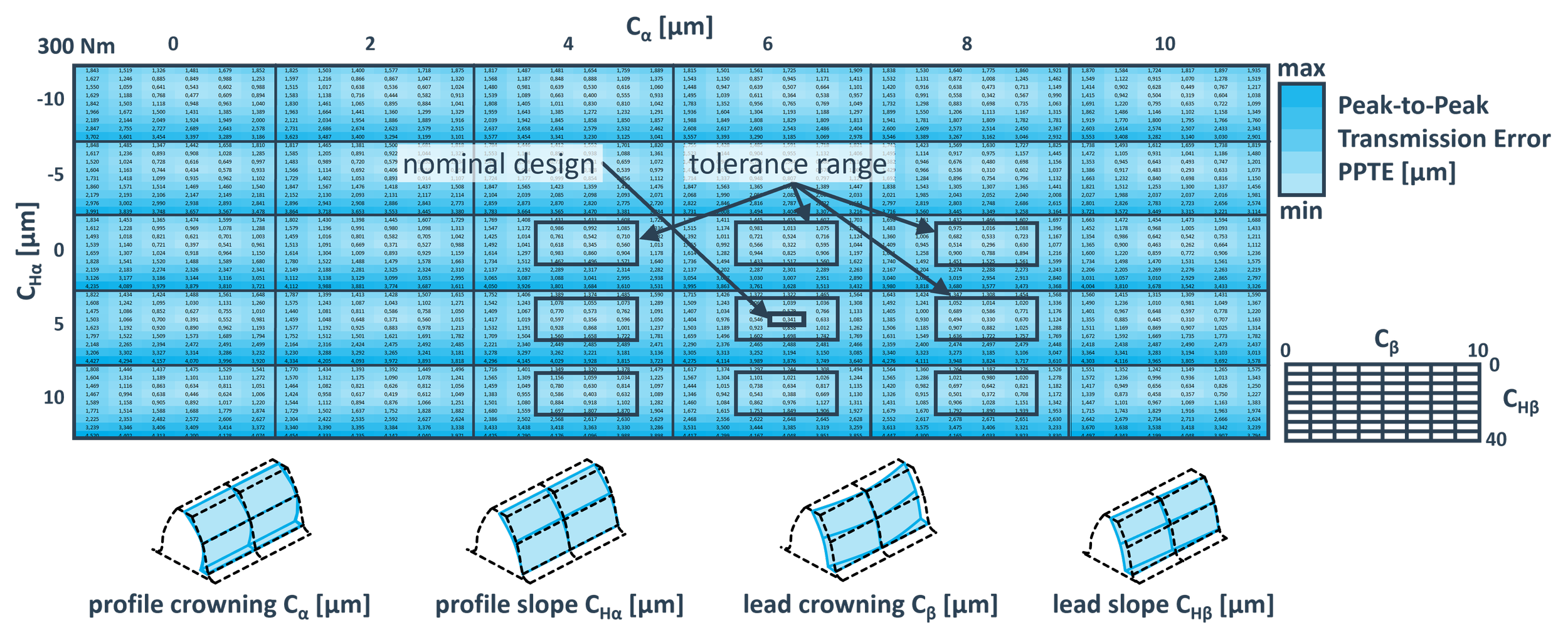 Bei einer weiteren Studie wird ein Kennfeld des Drehwegfehlers ermittelt für unterschiedliche Drehmomente T und Variationen der vier Flankenmodifikationen: Profilwinkel CHα, Profilballigkeit Cα, Flankenwinkel CHβ, Flankenballigkeit Cβ (s. Abbildung 3 und Abbildung 4). Dadurch lässt sich ermitteln, ob die nominelle Auslegung der Flankenmodifikationen auch über das fertigungsbedingte Toleranzfeld robust niedrige Verzahnungsanregungen aufzeigt.