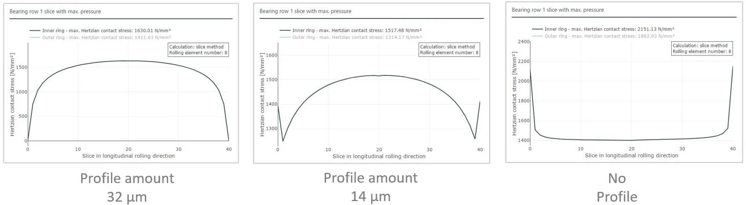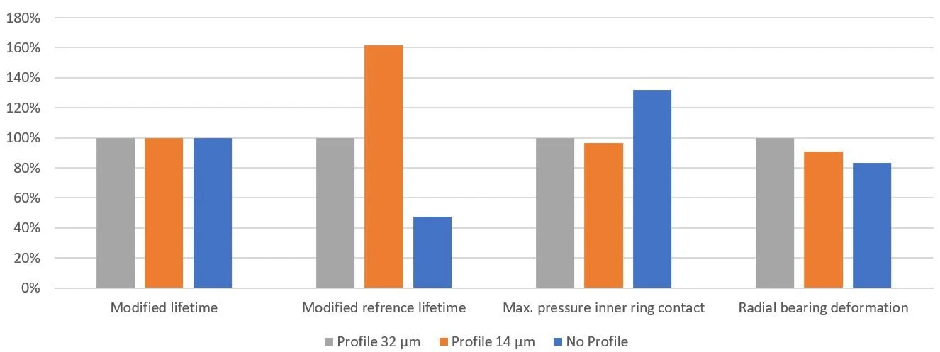 • Die Profilierung hat keinen signifikanten Einfluss auf die Ergebnisse der erweiterten Lebensdauerberechnung (sowohl nach ISO 281 als auch nach den Katalogberechnungen der Lagerhersteller). Es können sich lediglich kleinere Unterschiede ergeben, wenn aufgrund der geänderten Lagersteifigkeit in der Gesamtsystemberechnung, leicht unterschiedliche Lagerkräfte berechnet werden.